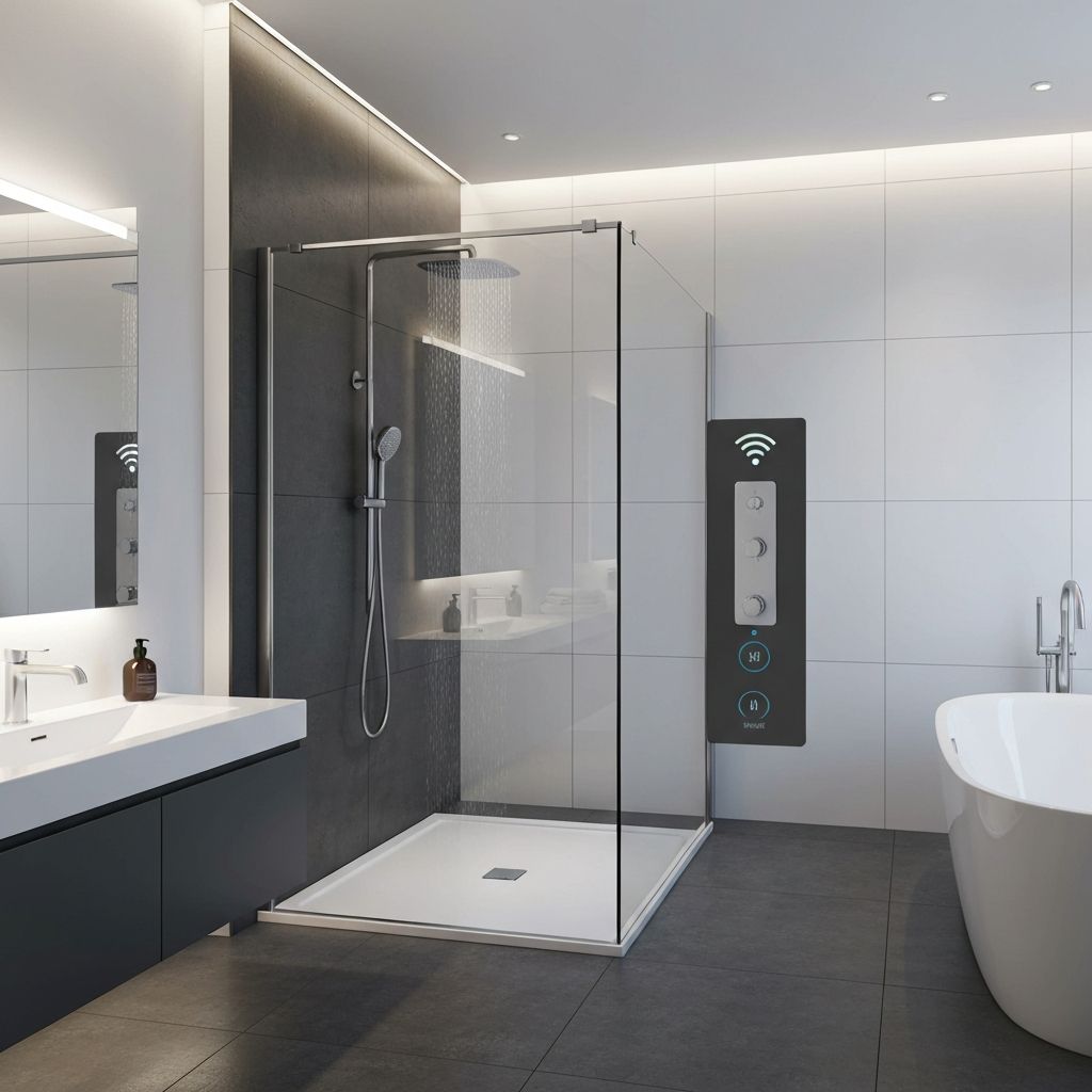 Luxury bathroom with voice-activated features and smart systems.