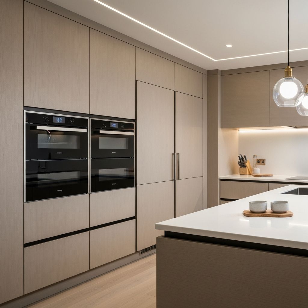 Luxury kitchen with integrated smart appliances and automated lighting.