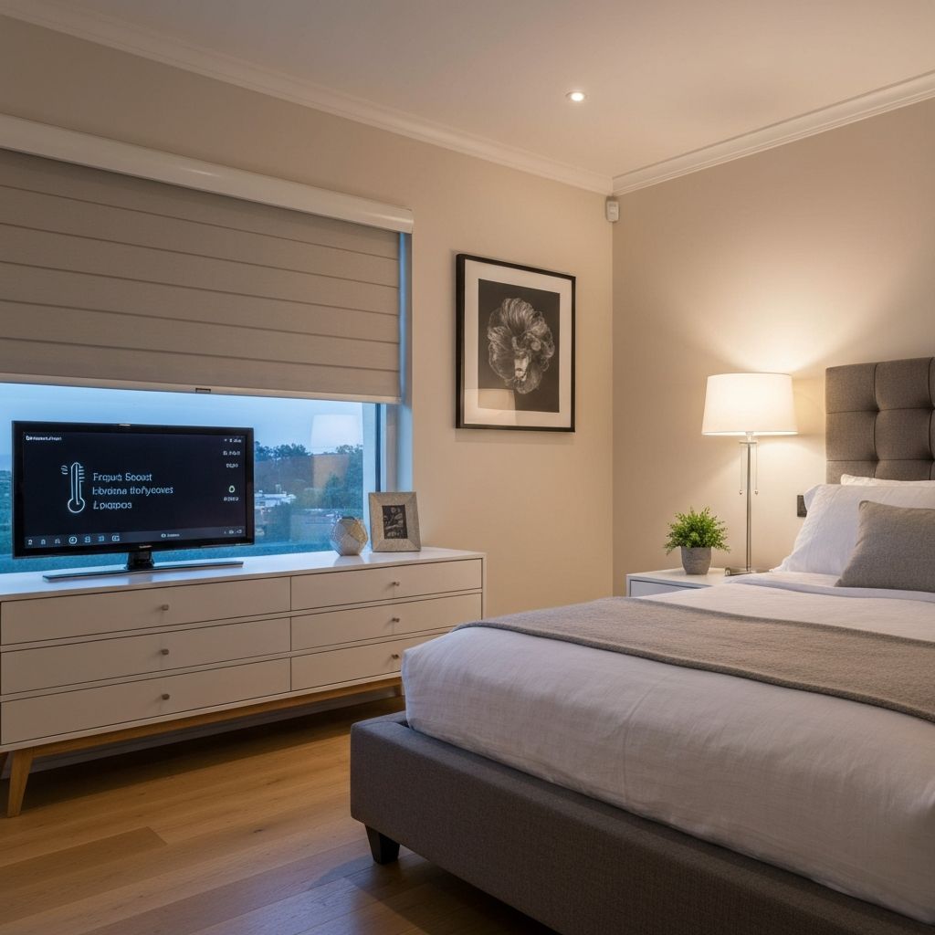 Luxury bedroom automation with lighting and climate control.